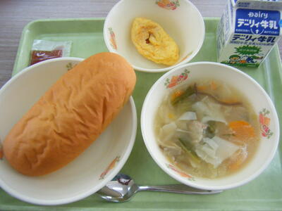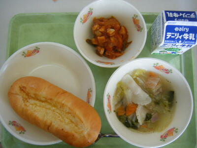 今日の給食のメニューは、野菜スープ、ジャーマンポテト、黒糖パン。牛乳でした。