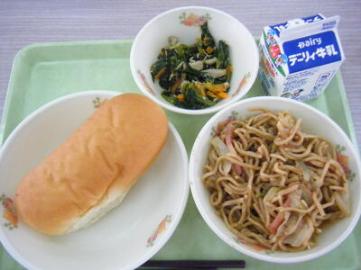 今日の給食のメニューは、焼きそば、ほうれん草のソテー、減量コッペパン、牛乳でした。