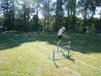 そのあと、振り上げ足、抜き足、それを組み合せた動きを練習し、1台だけハードルを跳び越す練習をしました。