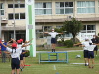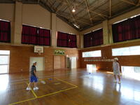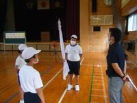 市のマイクロバスで串間中学校に移動し、串間中の体育担当の先生2名からご指導いただきました。
