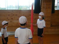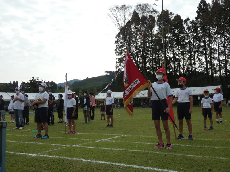 開会式では、2・3年児童が児童代表のことば、各団長の児童が選手宣誓、4年児童が競技上の注意とラジオ体操の指揮を行いました。