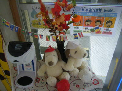 色紙で赤白帽を作り、保健室にあったぬいぐるみにかぶせました(帽子には秋山小の校章も付けました)。