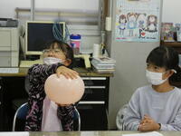 近くを見ている時の目の様子(水晶体が風船、毛様体が手)を体験させることで、近くを見ている時には、目に負担がかかっていることに気づかせました。