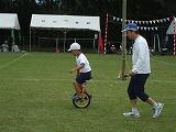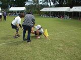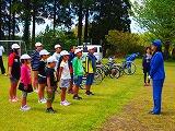 運動場を道路にみたて、徒歩の場合、自転車にのっている場合を想定して練習しました。