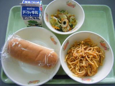 今日の給食は、減量コッペパン、スパゲティミートソース、ブロッコリーのソテー、牛乳でした。