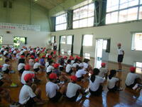 残念ながら途中で雨が強くなり、ラジオ体操を途中で切り上げて体育館に移動しました。