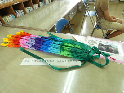 秋山小学校の児童、保護者、職員が平和への願いや思いを込めて作った千羽鶴です。その願いや思いが日本中、世界中に広がっていくことを願っています。