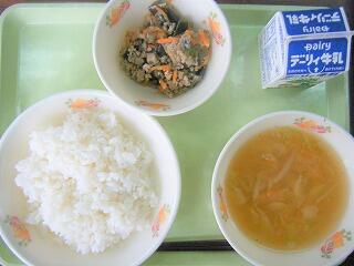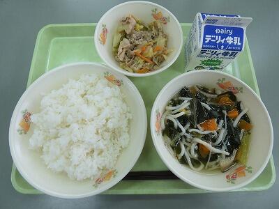 今日の給食のメニューは、わかめスープ、豚肉の梅しょうが焼き、麦ご飯、牛乳でした。