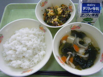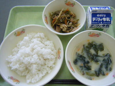 今日の給食は、麦ご飯、豆乳みそ汁、茎わかめの炒め物、牛乳でした。