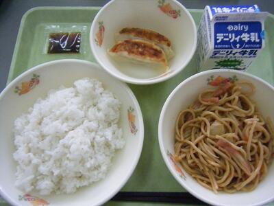 今日の給食は、減量麦ご飯、焼きぞば、ギョーザ、タレ、牛乳でした。