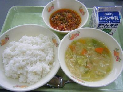 今日の給食は、麦ご飯、つみれ団子汁、ビビンバ丼、牛乳でした。