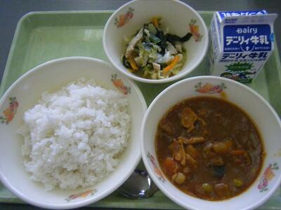 今日の給食は、麦ご飯、夏野菜カレー、温野菜、牛乳でした。