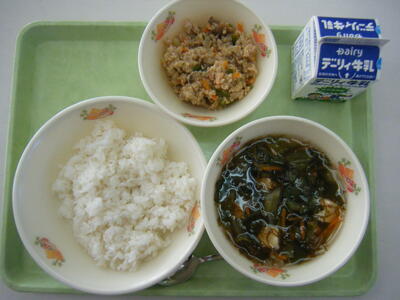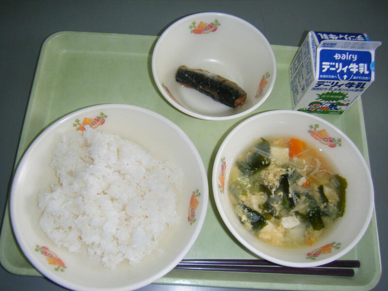 今日の給食のメニューは、かきたま汁、いわしの梅煮、白ご飯、牛乳でした。