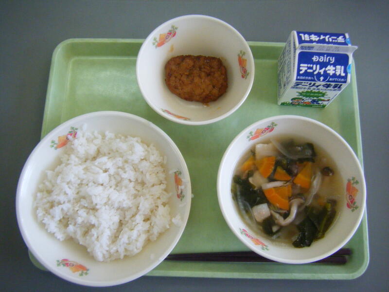 今日の給食のメニューは、もずくのスープ、肉みそ丼の具、麦ご飯、牛乳でした。