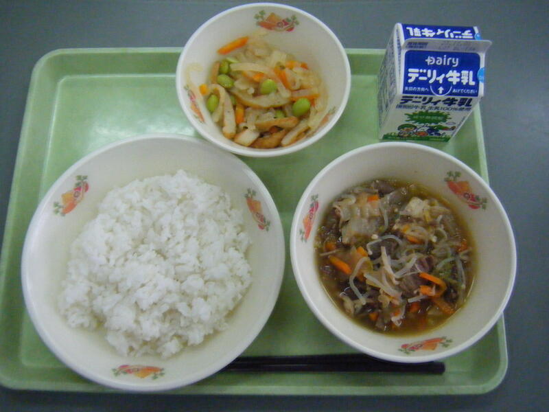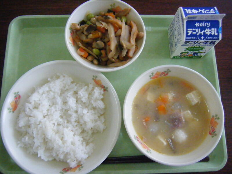 今日の給食のメニューは、豚汁、五目豆、麦ご飯、牛乳でした。