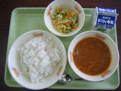 今日の給食のメニューは、キーマカレー、温野菜、麦ご飯、牛乳でした。