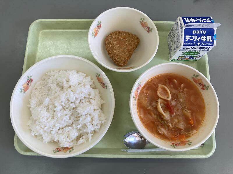 今日の給食のメニューは、ミネストローネ、かぼちゃ挽肉フライ、麦ご飯、牛乳でした。