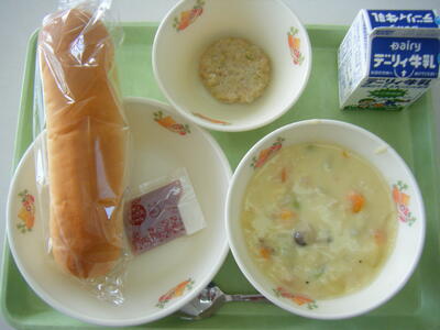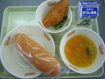 今日の給食のメニューは、かぼちゃのスープ、サーモンフライ、ゆでブロッコリー、コッペパン、牛乳でした。
