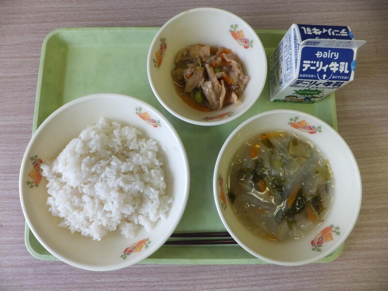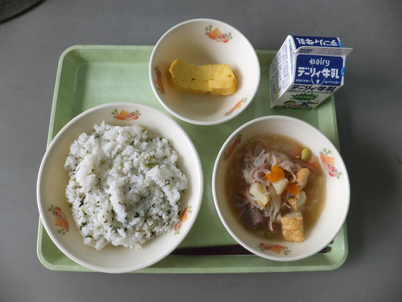 今日の給食のメニューは、肉じゃが、厚焼き卵、菜飯、牛乳でした。