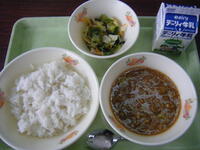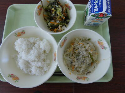 今日の給食のメニューは、マーボ春雨、いそか炒め、減量麦ご飯、牛乳でした。