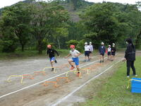 体育館で準備運動をした後、運動場に移動し、ミニハードルを使ってアップをしました。
