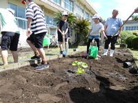 はじめの会で地域の方の紹介をしたあと、2回優勝した経験があるという方のご指導のもと、肥料をまき、苗植えをしました。
