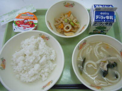 今日の給食は、減量麦ご飯、五目うどん、れんこんのピリ辛炒め、アセロラゼリー、牛乳でした。