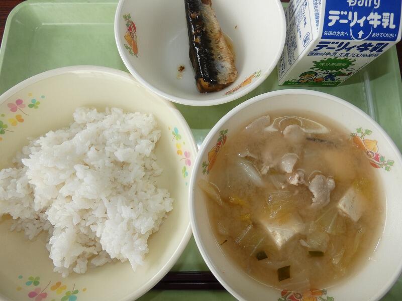 今日の給食のメニューは、豚汁、さばしょうが煮、麦ご飯、牛乳でした。