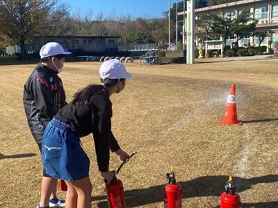 串間市消防本部、旭消防設備の方々のお話を聞き、消火訓練では全児童が水消火器を使った消火訓練をしました。