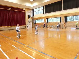 体育館で行う場合は、徒競走ができないので代わりに一輪車障害走(3年生以上)を行います。