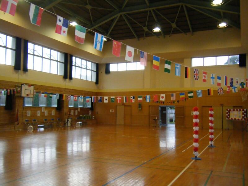 体育館で行うのは初めてですので保護者とも相談しながらスローガンの掲示の位置や万国旗の貼り方などを決めました。