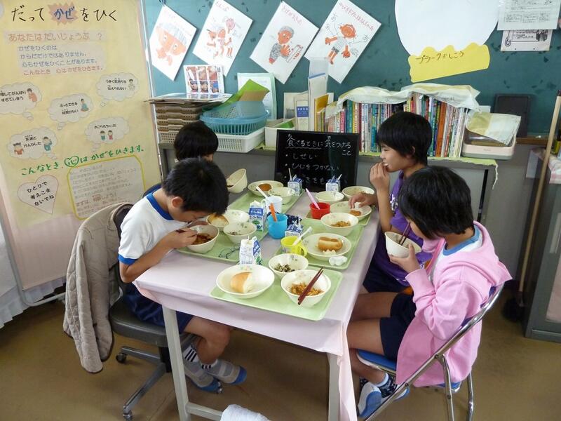 3~4人ずつ縦割りグループに分かれ、保健室で給食を食べています。
