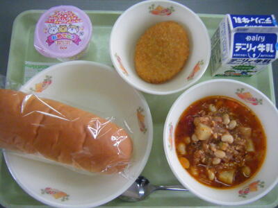 今日の給食のメニューは、チリコンカン、日向どりコロッケ、お祝いイチゴゼリー、コッペパン、牛乳でした。