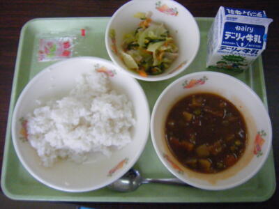 今日の給食のメニューは、ビーフカレー、温サラダ、ごまドレッシング、麦ご飯、牛乳でした。