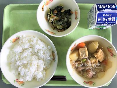 今日の給食のメニューは、肉じゃが、いそか炒め、麦ご飯、牛乳でした。