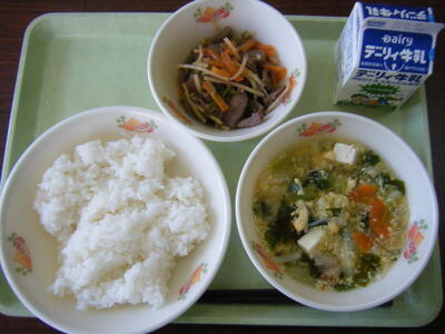 今日の給食のメニューは、高野豆腐の卵とじ、小松菜とごまの炒め物、菜飯、牛乳でした。