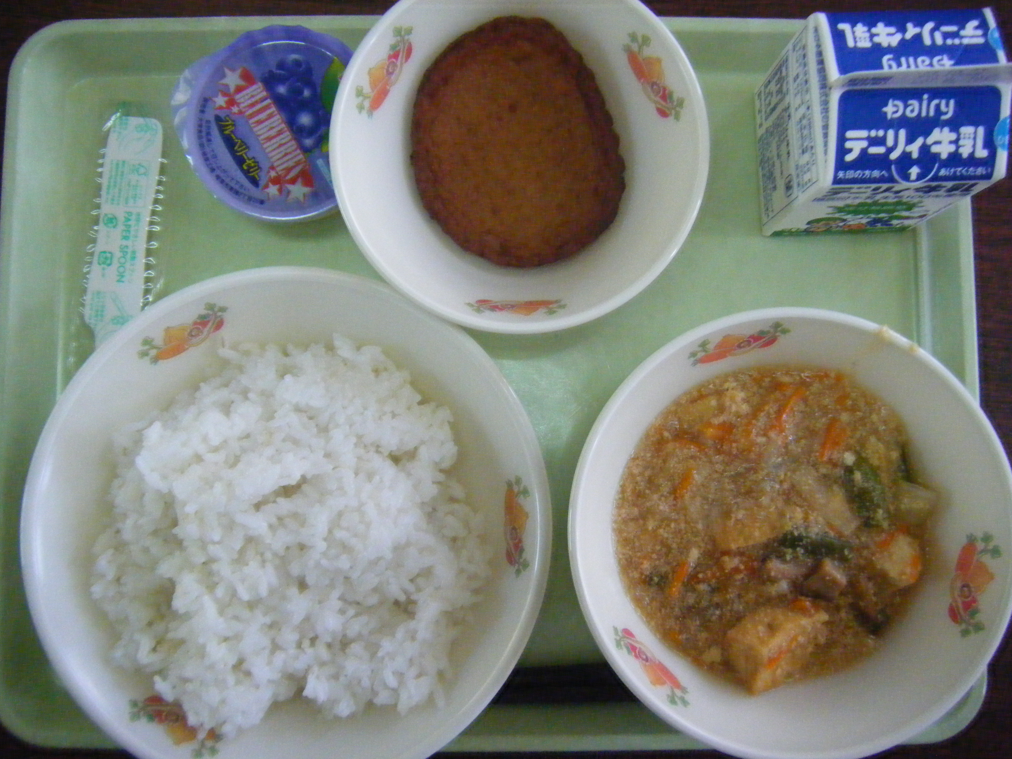 今日の給食のメニューは、マーボー豆腐、ほうれん草とささみの炒め物、麦ご飯、牛乳でした。