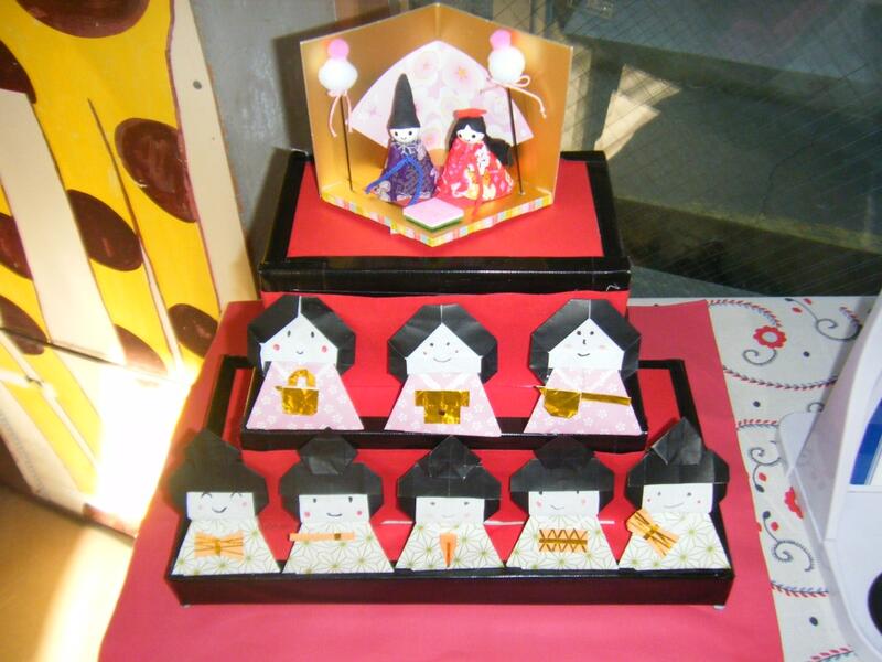 上の写真の雛飾りの三人官女と5人囃子は、本校の教頭が色紙で作成し、目や口などは、児童が書き込みました。