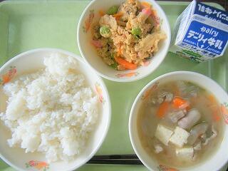 今日の給食のメニューは、三色つみれ汁、肉豆腐、麦ご飯、牛乳でした。肉豆腐は、新メニューだそうです。