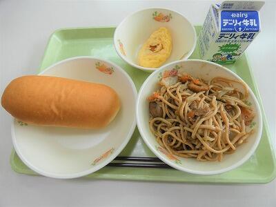 今日の給食のメニューは、焼きそば、トマトオムレツ、減量コッペパン、牛乳でした。