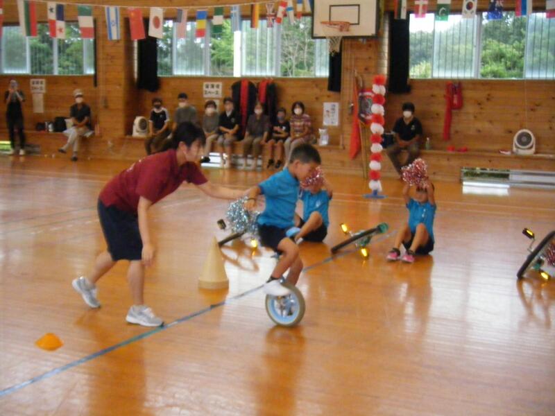 体育館で行う場合は、徒競走ができないので代わりに一輪車障害走(3年生以上)を行います。