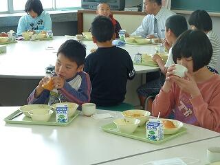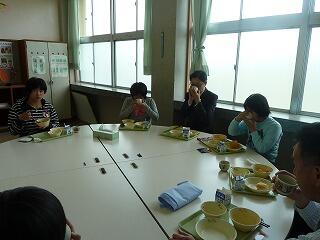 お昼には、高齢者の方々といっしょに給食を食べました。
