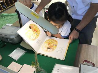 授業では明るいところとくらいところで絵本を読み、読みやすさを体感してもらいました。