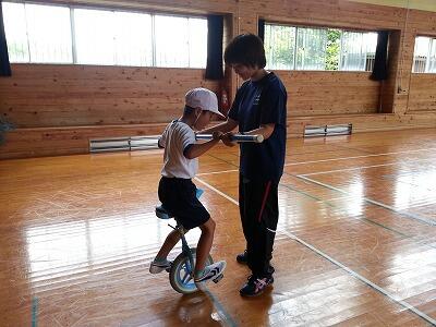 先生に支えながら1年生も一輪車に乗ることができるようになりました。