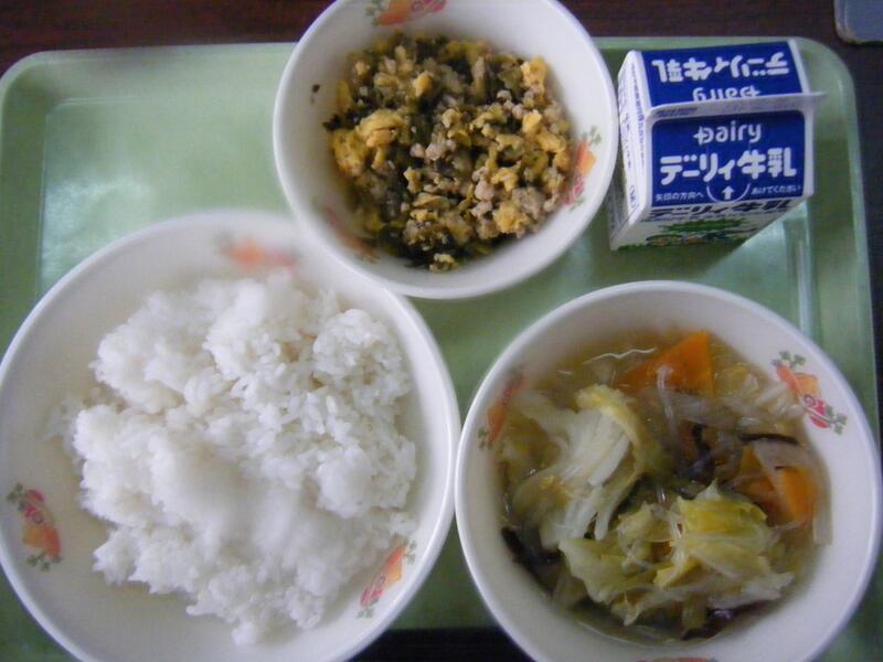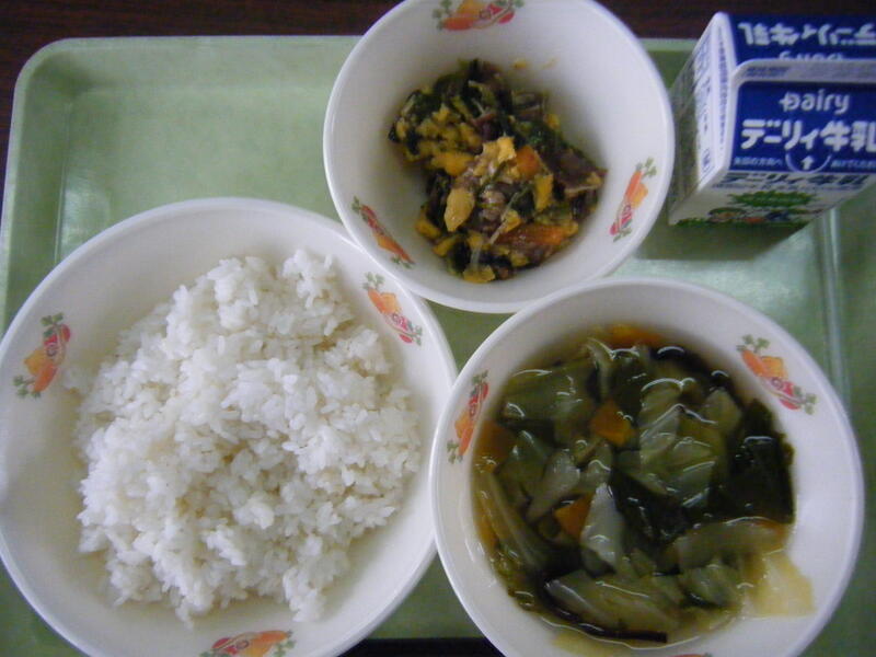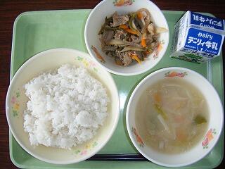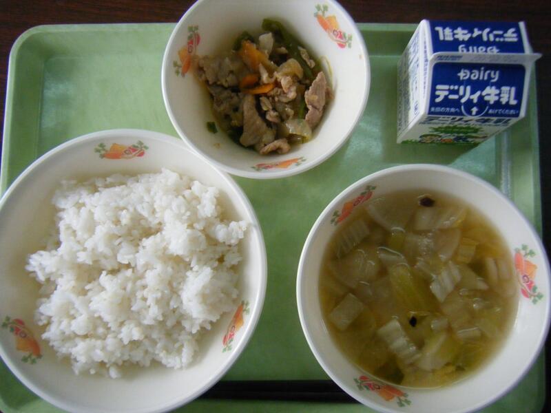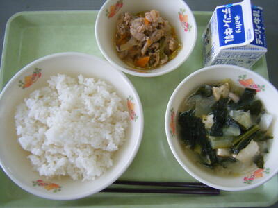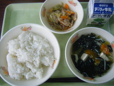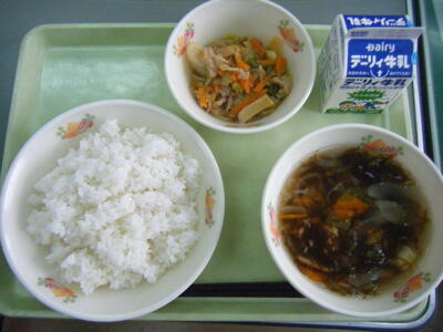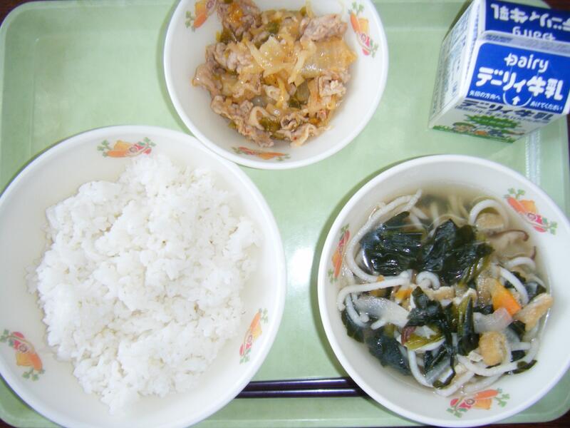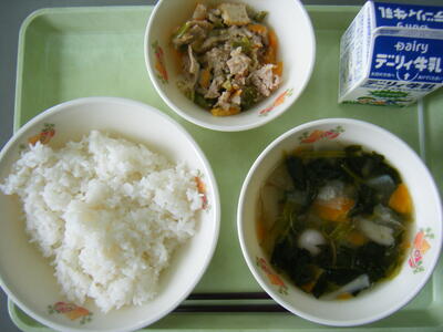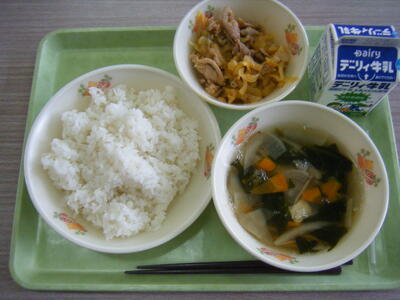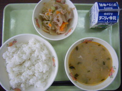 今日の給食のメニューは、吉野汁、豚肉のみそ炒め、白ご飯(ミルキークイーン)、牛乳でした。