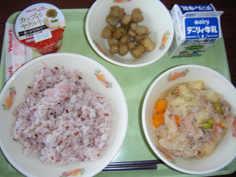 今日の給食のメニューは、肉じゃがたたきごぼう、カップdeヤクルト、十二穀ご飯、牛乳でした。