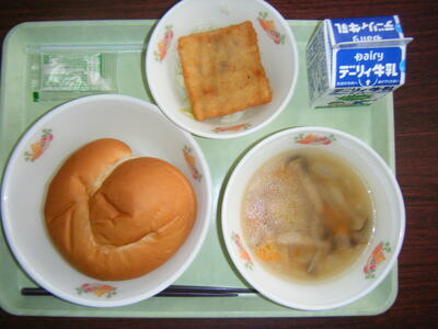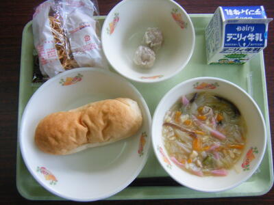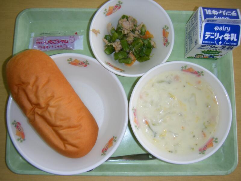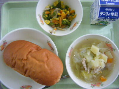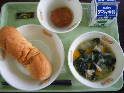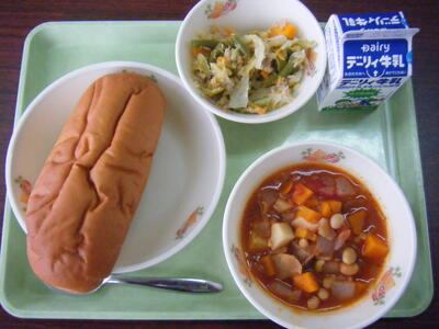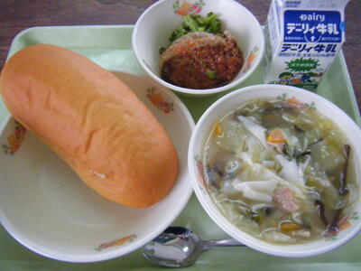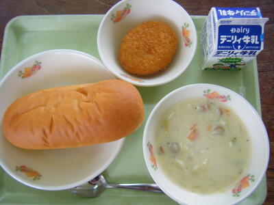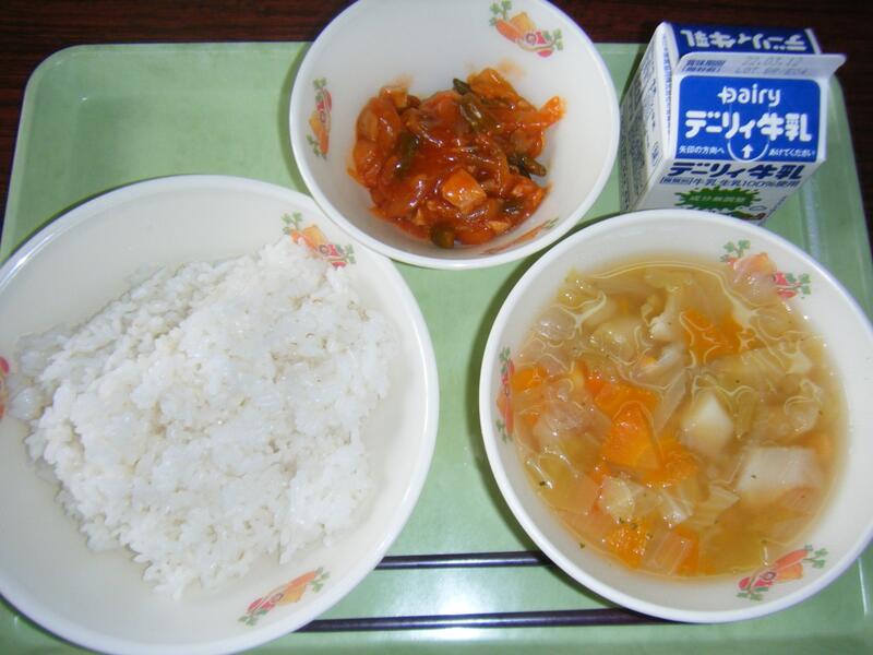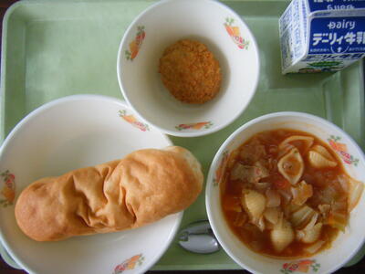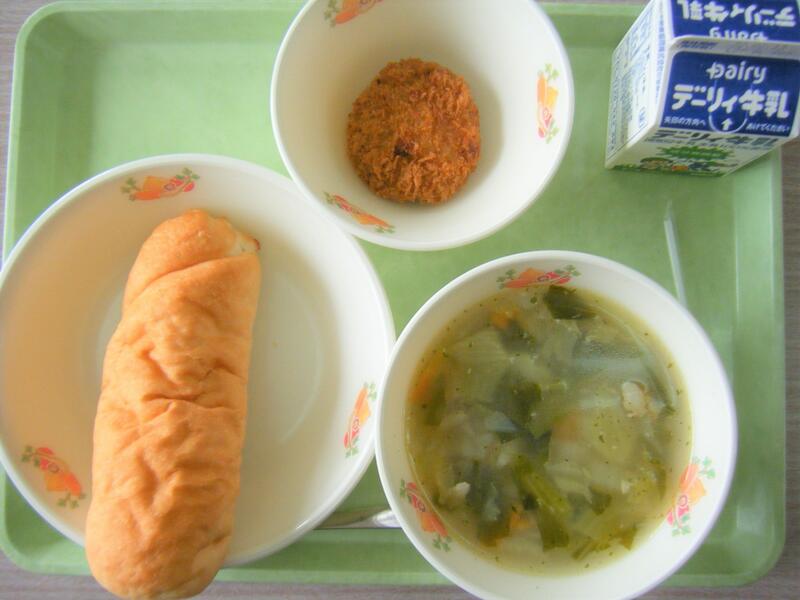 今日の給食のメニューは、ミネストローネ、メンチカツ、マヨネーズパン、牛乳でした(今日は画像はありません)。