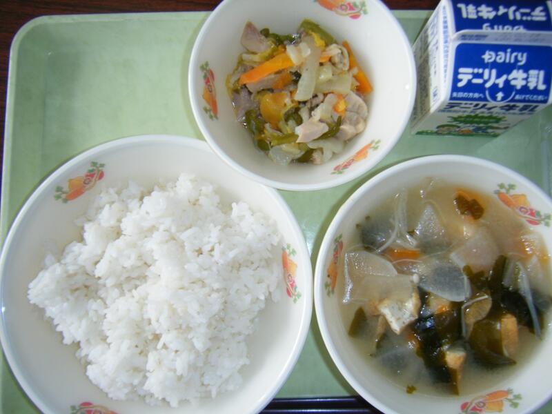 今日の給食のメニューは、具だくさんのみそ汁、茎わかめの炒め物、麦ご飯、牛乳でした。