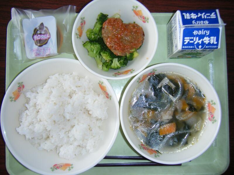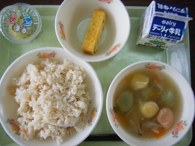 今日の給食のメニューは、三色つみれ汁、千草焼き、子どもの日デザート(ゼリー)、たけのこご飯、牛乳でした。