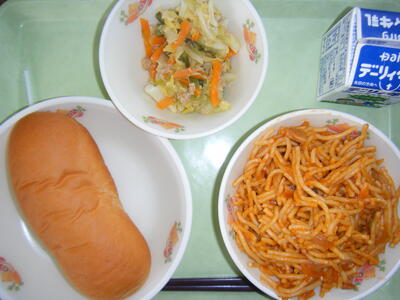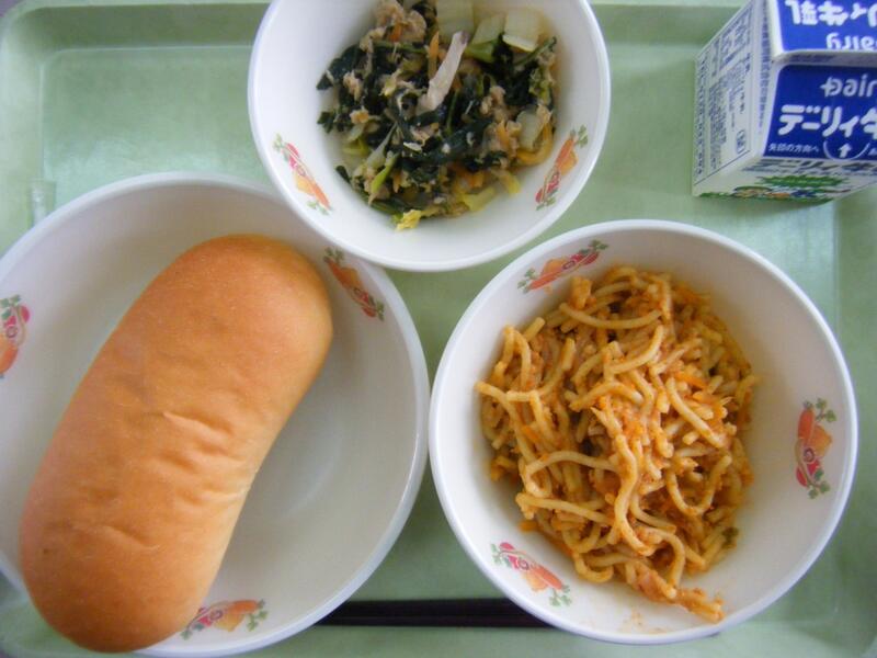 今日の給食のメニューは、スパゲティーミートソース、小松菜とツナのソテー、減量コッペパン、牛乳でした。